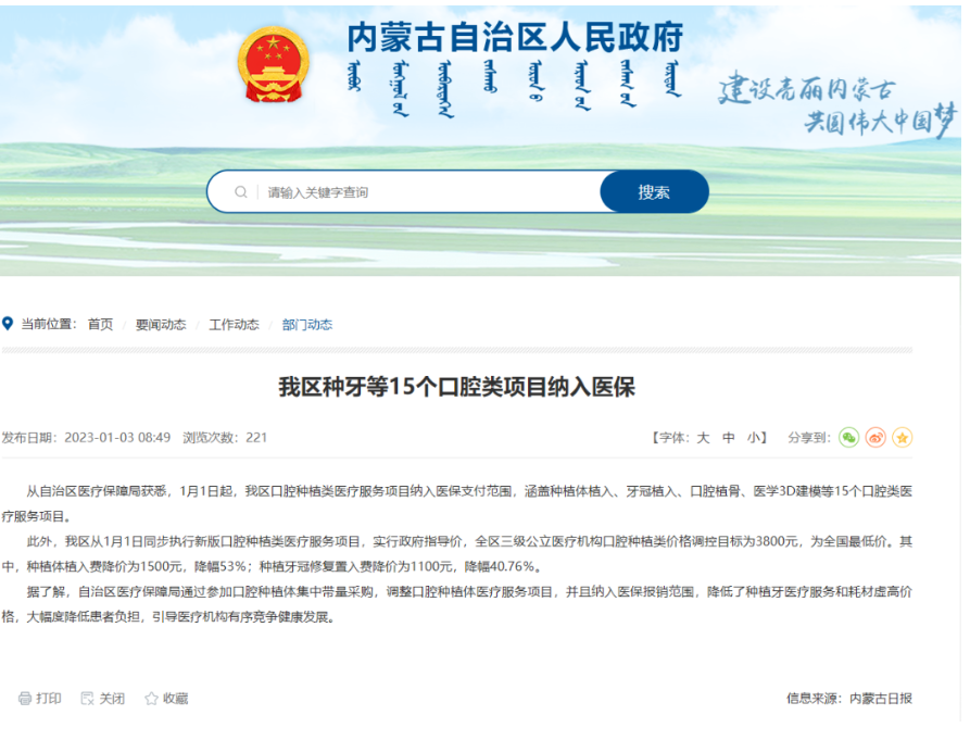 近日,内蒙古自治区人民政府官网发布工作动态,自2023年1月起,内蒙古自治区口腔种植类医疗服务项目纳入医保支付范围,涵盖