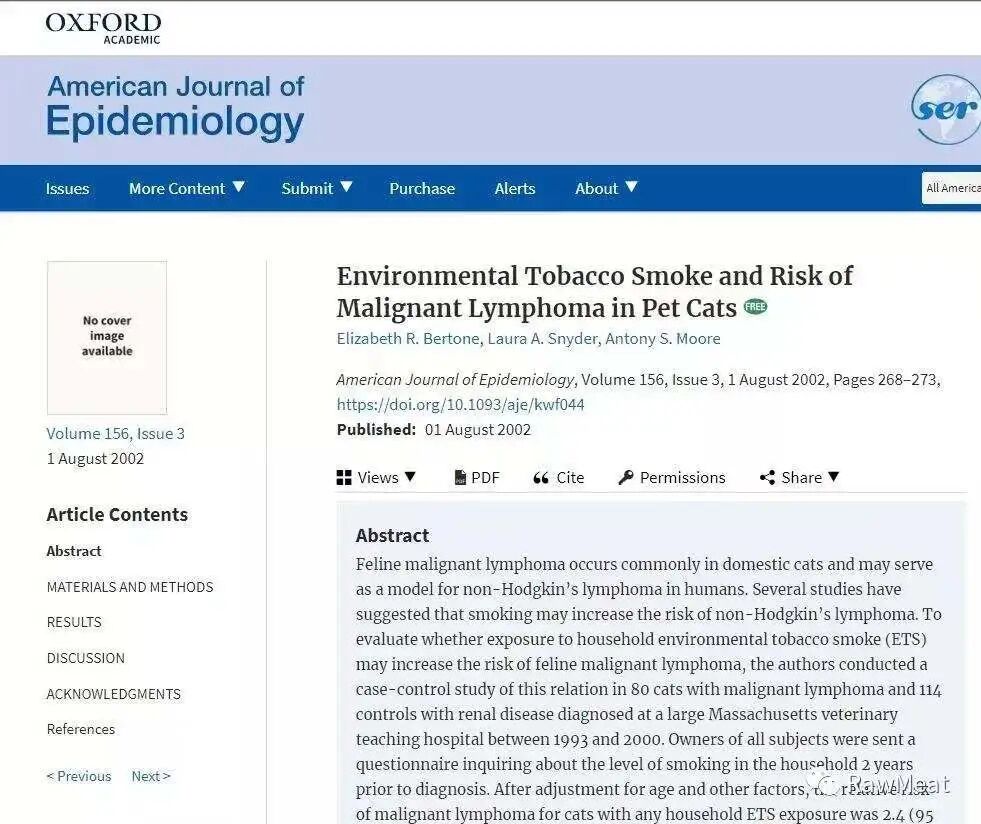 https://academic.oup.com/aje/article/156/3/268/71617,Bertone ER, Snyder LA, Moore AS. 《Environmental Tobacco Smoke and Risk of Malignant Lymphoma in Pets.》