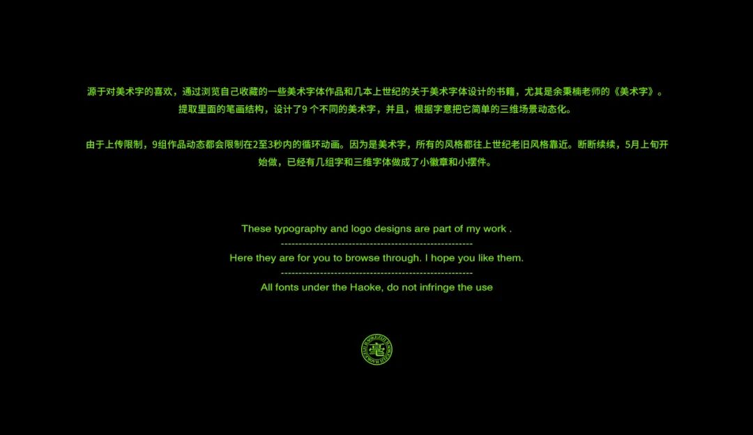 These typography and logo designs are part of my work . ------------------------------------------------------ Here they are for you to browse through. I hope you like them. ------------------------------------------------------ All fonts under the Haoke, do not infringe the use. ------------------------------------------------------站酷:https://www.zcool.com.cn/work/ZNTM5MTA1NzI=.html