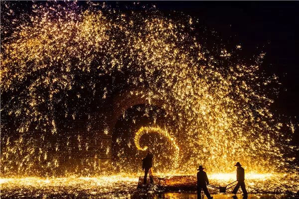 为了营造更为热烈的场面,表演艺人会趁着前一场烟花还未散尽时,接连再泼上几勺铁水,让火花此起彼伏,错落有致,给人们呈献了一出别致的视觉盛宴。