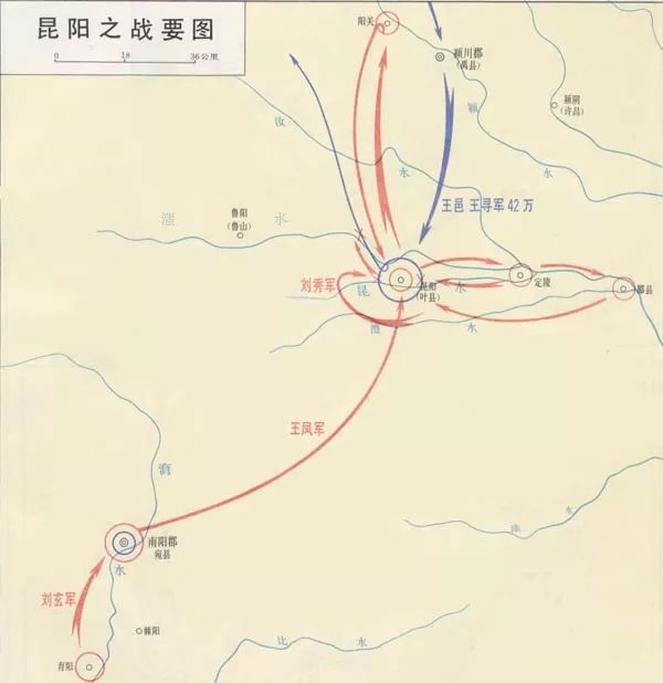 史载:会大雷风,屋瓦皆飞,雨下如注,莽军溺死者以万数。更始军变得完全主动,竟然奇迹般的一举击垮了号称百万,实则40多万的王莽大军,所得车甲珍宝,不可胜数。昆阳之战是中国历史上以少胜多的经典战例,作为这场战争的策划者和组织者,刘秀刚柔相济的作风已初见端倪,他善于说服不同意见者,团结能团结的力量,并展现出深远的战略眼光、卓越的军事指挥才能和勇猛无畏的战斗精神,令世人惊叹。
