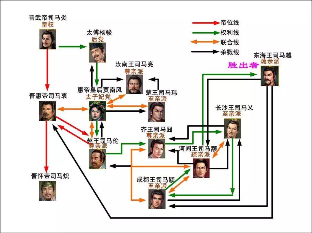 晋武帝死后,变乱首先从宫廷里爆发了,公元290年,太子司马衷即位,就是晋惠帝,这位糊涂愚蠢的皇帝,成为了皇后贾南风的傀儡,王朝大权很快落在了贾南风手里,在她的唆使下,司马氏诸王自相残杀,贾南风甚至还杀害了惠帝的太子,贾南风的恶行引起了诸王和朝臣的不满。公元300年,赵王司马伦起兵入京,杀死贾南风等人,拉开了八王之乱的序幕,公元291年到公元306年,先后有八个当初被晋武帝分封的王,加入争夺权力的混战,这就是八王之乱。