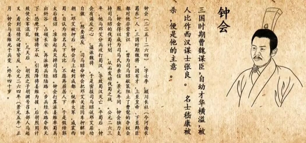 钟会是曹魏太傅——著名书法家钟繇[yáo]之子,自幼才华横溢。他只比嵇康小两岁,却折服于竹林名士嵇康的风采,钟会写了篇《四本论》,讨论人的才能、秉性的异同、离合问题,他希望得到嵇康的肯定,钟会怀抱文章来到嵇康的家门口,又犹豫起来。于是,在户外远远地将文章掷入,转身就急急忙忙跑了。