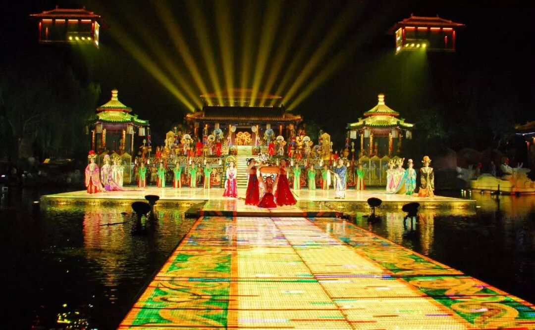 在今天的骊山脚下,每天都要演出大型山水历史舞剧《长恨歌》,它是以唐朝华清宫遗址为背景,以盛唐文化为主题,根据白居易的名篇《长恨歌》改编创排而成。这部舞剧最华彩的一场就是贵妃出浴。在唐朝,每年秋冬,唐玄宗都要和杨贵妃一起,来到骊山脚下的温泉宫,洗浴宴饮,日夜欢娱,弦歌不辍。唐玄宗将管理大唐江山的大权,交给他心目中的忠臣杨国忠,想必他一定感到很放心。因为,有了这样的干吏,他就可以放手朝政,带着心爱的妃子杨玉环,一心一意享受他幸福的晚年生活。为了给唐玄宗的生活增添更多的色彩,皇亲国戚也竞相呈献食物。为此,唐玄宗专门任命饮食检查官,每次呈献的食物,出产的各种珍贵菜肴多达数千盘。每一盘的费用就耗尽当时中产阶级十家以上财产。