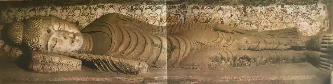 158窟是开凿于吐蕃统治敦煌时期的一个典型洞窟,在佛坛之上,一座长达15.6米的涅槃佛像静静地躺在那里。“涅槃”是指灵魂脱离肉体,脱离六道轮回,进入不生不灭的佛教最高境界。这尊佛右胁而卧,神态安详,唇含笑意,没有世人临终的苦痛,表现了“寂灭为乐”的涅槃世界。