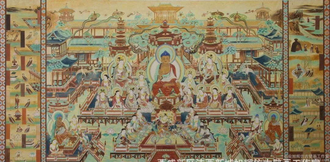 172窟是盛唐时期经变画中杰出的代表作品,这个洞窟南北两壁的主要内容是《观无量寿经变》,北壁经变画中以西方净土为主,以佛为中心,这是三维复原后效果,四周绘有场面宏大的寺院建筑群,它规模宏大,气势磅礴,形体俊美,庄重大方,整齐而不呆板,华美而不纤巧,舒展而不张扬。雄伟壮观的楼台亭阁,耸立在碧波荡漾的七宝莲池中,这是唐代壁画中表现建筑群的典型代表作。
