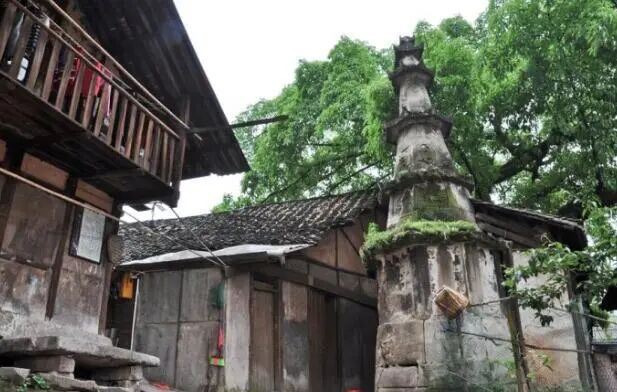 惜字亭位于一棵大黄角树下,该亭虽不宏大壮观,但于浓荫下也颇显古朴。惜字亭建成于乾隆五十五年,共六层八方,仿八卦图型,高8米,每层每方都刻有深浮雕图案,且不相同,是“天后宫”烧钱化纸的地方,所以又叫“字库”,俗称“化钱炉”。