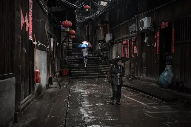 福宝依山而建,整个场镇建筑在一座鱼脊形的丘峦半岛之上,并且东西两段地势跌宕突然,形成了高低错落、层叠错落的街市空间。鳞次栉比的屋宇千姿百态,排排吊脚木楼错落有致,随山势起伏。小街宽处七八米,窄处仅一米半左右,全部系青石板铺就,石阶起起落落,蜿蜒伸向前方。不时见撑伞的行人在石梯间上上下下,朦胧间呈现出一幅幅雨中小镇的诗意画面。