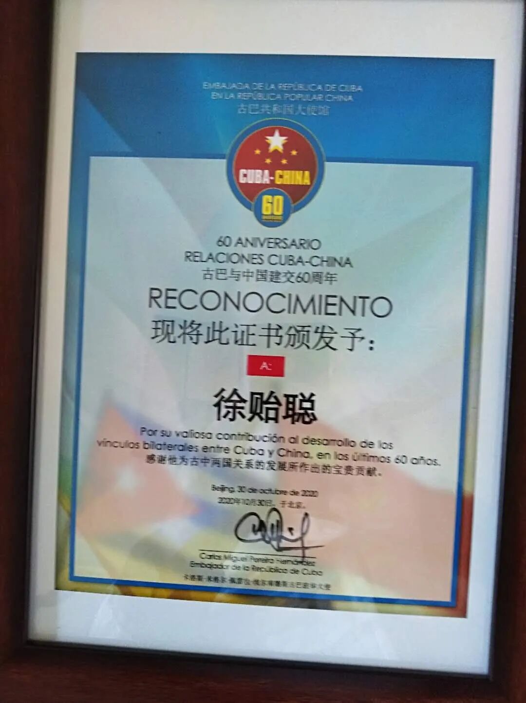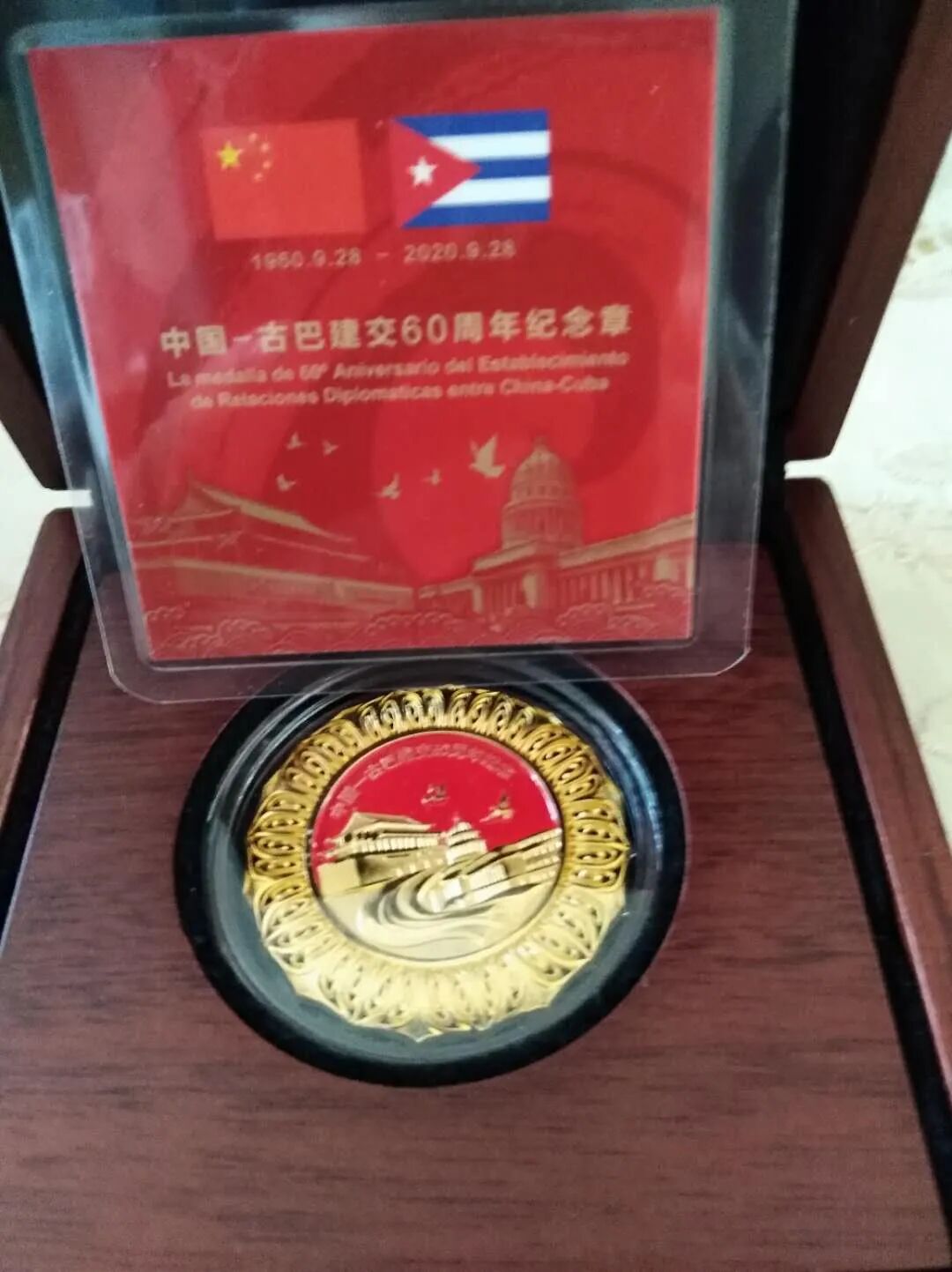 奖状上写道:“在此古巴与中国建立外交关系60周年之际,古巴共和国大使馆现将此证书颁发予徐貽聪,感谢他为古中两国关系的发展所作出的宝贵贡献。”证书上有佩雷拉大使的签名,署的日期是2020年10月30日。纪念章则两面各有含义,一面是代表两国首都的天安门城楼和古巴哈瓦那的两座标志性建筑,另一面是显示两国革命摇篮的井冈山和玛尔斯特拉山,象征意义十分强烈。佩雷拉大使在致辞中还简要地提到我的参与情况,特别说到我在哈瓦那被卡斯特罗主席亲切地称为“小虎”的片段(卡斯特罗出生于1926年,也是“虎年”,长我一轮,故称我为“小虎”),引起听众的笑声。确实,我与古巴人民“革命领袖”卡斯特罗主席的特殊友情,让我荣耀,让我终生难忘。我说我对此感到高兴、荣幸、骄傲,绝非是自我标榜,也不是自吹自擂,因为除去与卡斯特罗,还有劳尔·卡斯特罗的亲切关系以外,我还几乎参与了中古新型关系发展的全进程,多方位、多角度、多层次地直接参加了许多事件,及至中方政策的安排,并从中有自己的感悟和领受。