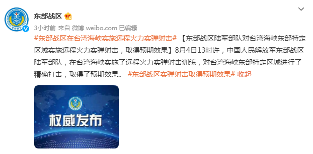 8月4日13时许,中国人民解放军东部战区陆军部队,在台湾海峡实施了远程火力实弹射击训练,对台湾海峡东部特定区域进行了精确打击,取得了预期效果。