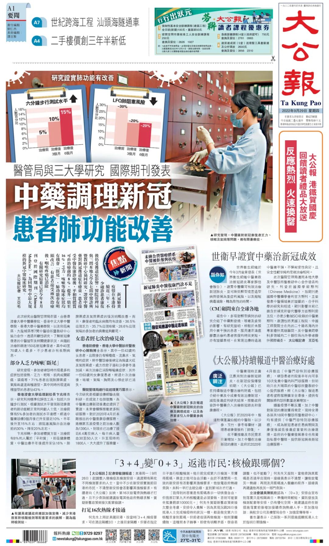 中醫藥現時正廣泛應用到治療新冠肺炎,在新冠疫情爆發初期,《大公報》已在持續報道中醫治療的好處,包括介紹中藥及中成藥有效治療新冠,減低後遺症的研究結果,推動政府容許中醫藥介入治療新冠肺炎和復康療程。
