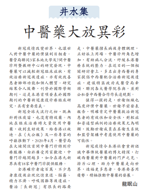 全港確診者逾百萬,不少患者康復後出現記憶衰退、腦霧、精力不濟、呼吸困難等後遺症,醫治「長新冠」有很長的路要走,中醫藥擅長病後身體調理,正好派上用場。中醫診所角色增加,有助病人分流,紓緩本港醫療系統的壓力。在近日的一個相關研討會上,多名出身西醫的專家提倡中西醫配合治療新冠後遺症,建議特區政府或醫管局牽頭,聯同各大醫學院參與,並對公私營中西醫合作作長遠規劃。