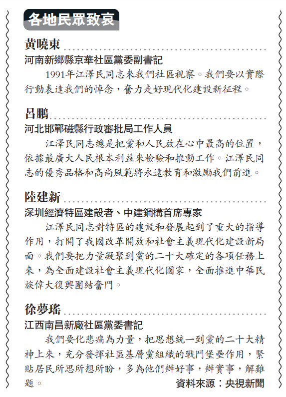 「江澤民同志帶領中國人民取得了重要發展成就,為中國特色社會主義事業作出了重要貢獻。」江蘇揚州市民杭樹志說,家鄉人民對於他的去世表達深切的哀悼。