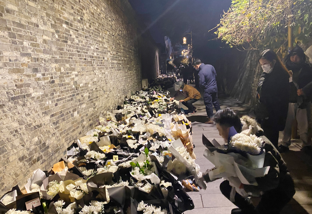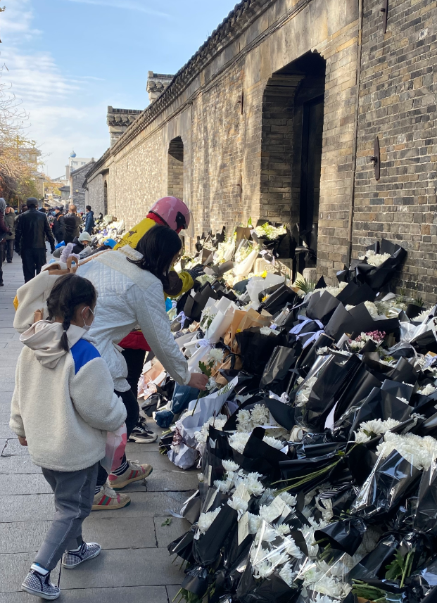 江澤民逝世的消息,讓全國廣大幹部群眾沉浸在悲痛之中。揚州是江澤民的故鄉。12月1日,揚州市東圈門古巷18號江澤民舊居門前,一層又一層白菊花與黃菊花鋪滿小巷,寄託着民眾對這位出自揚州的中共前領導人的哀悼與懷念。