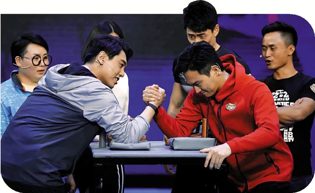 大陸綜藝節目《燃燒吧!卡路里》邀請港台明星參加。圖為張智霖即場和朱孝天在節目中扳手腕。(資料圖片)