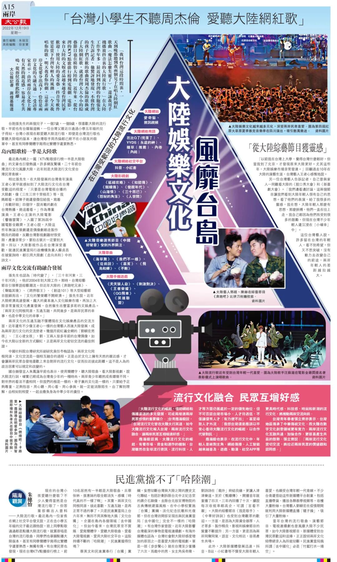 現在的台灣小孩愛聽什麼歌?不少人覺得當然是台灣流行歌了,但答案卻頗出人意料─大陸流行歌。最近島內一位家長在網上社交平台發文說,正在念小學五年級的兒子最近跟他說,班上同學點歌通通都是點播大陸流行歌,就算原唱是台灣的流行歌曲,同學們也寧願點播大陸版本,甚至有同學簡體字寫得比繁體字還要熟悉。無獨有偶。有台灣民眾也發現,現在台灣KTV點播排行榜上,前10名居然有一半都是大陸歌曲,且蔡依林、張惠妹的歌全都消失,感嘆「時代真的不一樣了啊」。其實,兩岸文化同根同源,彼此喜歡、互通互融,是再正常不過的事了。只是民進黨當局上台六年來,無所不用其極地大搞「文化台獨」,企圖在島內各個領域「去中國化」,但如今看來,台灣民眾並不買賬:愛寫簡體字、愛聽大陸歌曲、愛看大陸電視劇、愛用大陸社交平台。這股持續不斷的「哈陸潮」,民進黨擋得住嗎?