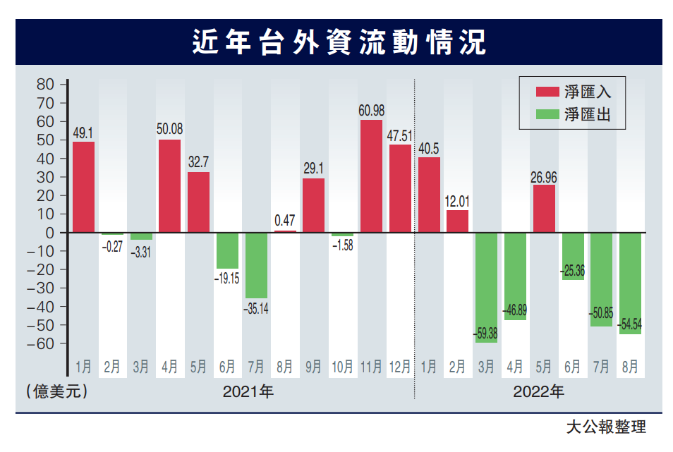 此外,台當局金融機構統計,台灣地區8個月外資淨匯出54.54億美元,是外資2011年以來單月第5大淨匯出量,且是連續第3個月淨匯出。累計今年前8個月外資淨匯出167億美元,創歷史同期新高。另一方面,今年前8個月整體外資合計從台股「提款」超過新台幣一萬億元,已超過歷年來外資全年賣超台股金額。島內輿論指出,國際資本減少對台灣地區的投資,對台灣經濟發展相當不利,最終受苦的還是台灣老百姓。