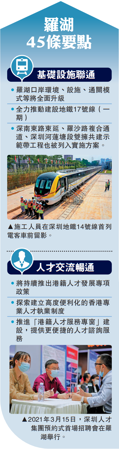實施方案顯示,羅湖暢通深港人才交流的七大舉措包括:出台港籍人才發展專項政策、實施港籍人才服務計劃、實施港籍人才住房保障計劃、設立港籍人才服務專窗、運營德勤大灣區雙創中心、運營香港工商專業和青年團體羅湖服務中心、建設深港青年創客中心。