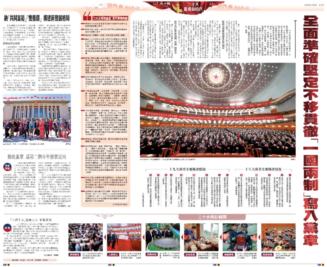 「一國兩制」是中國特色社會主義的偉大創舉。大會同意,把全面準確、堅定不移貫徹「一個國家、兩種制度」的方針寫入黨章。二十大報告強調,「一國兩制」是香港、澳門回歸後保持長期繁榮穩定的最佳制度安排,必須長期堅持。報告並就全面準確貫徹落實中央治港方針,以及支持港澳發展經濟改善民生,更好融入國家發展大局提出了新要求。一系列重要論述,再次彰顯了中央全面準確貫徹落實「一國兩制」的堅定決心,體現了中央對香港同胞的關心支持。