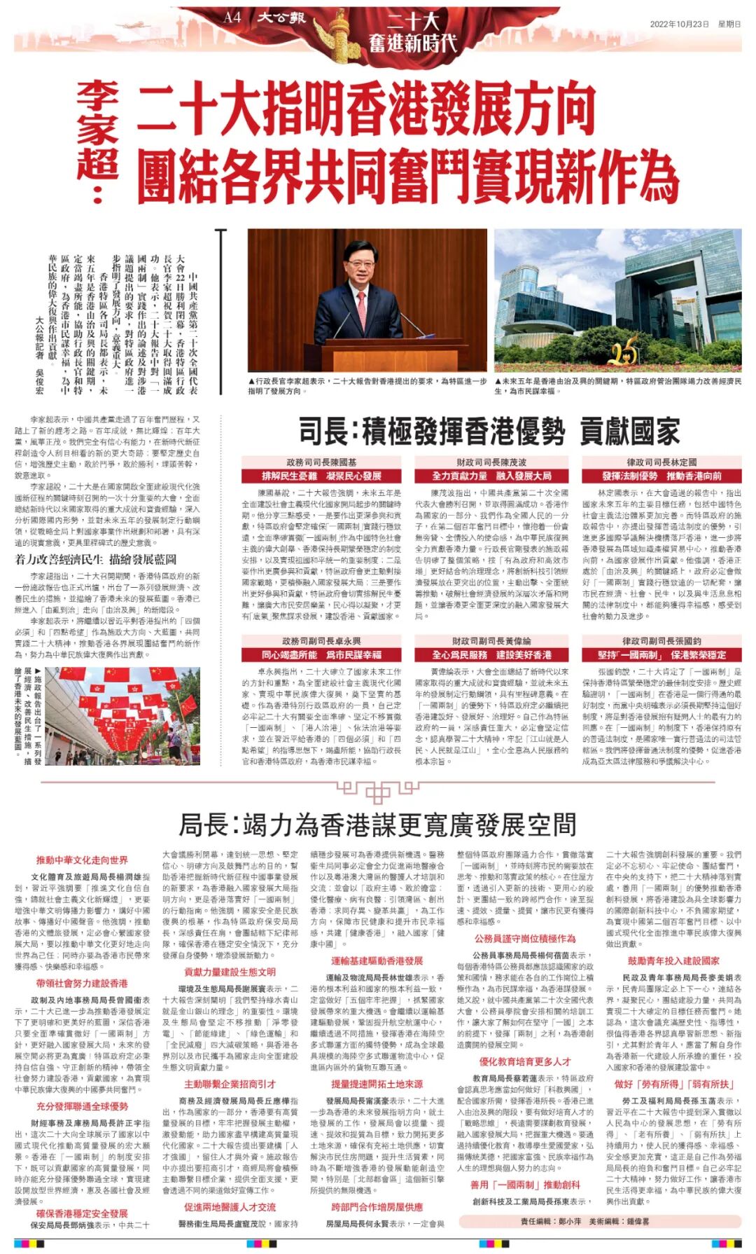 行政長官李家超表示,二十大報告對香港提出的要求,為特區進一步指明了發展方向。(大公報)