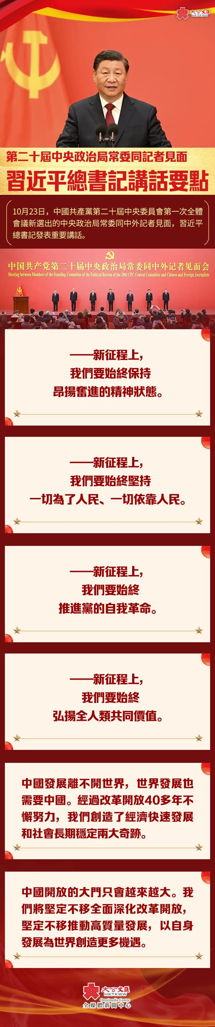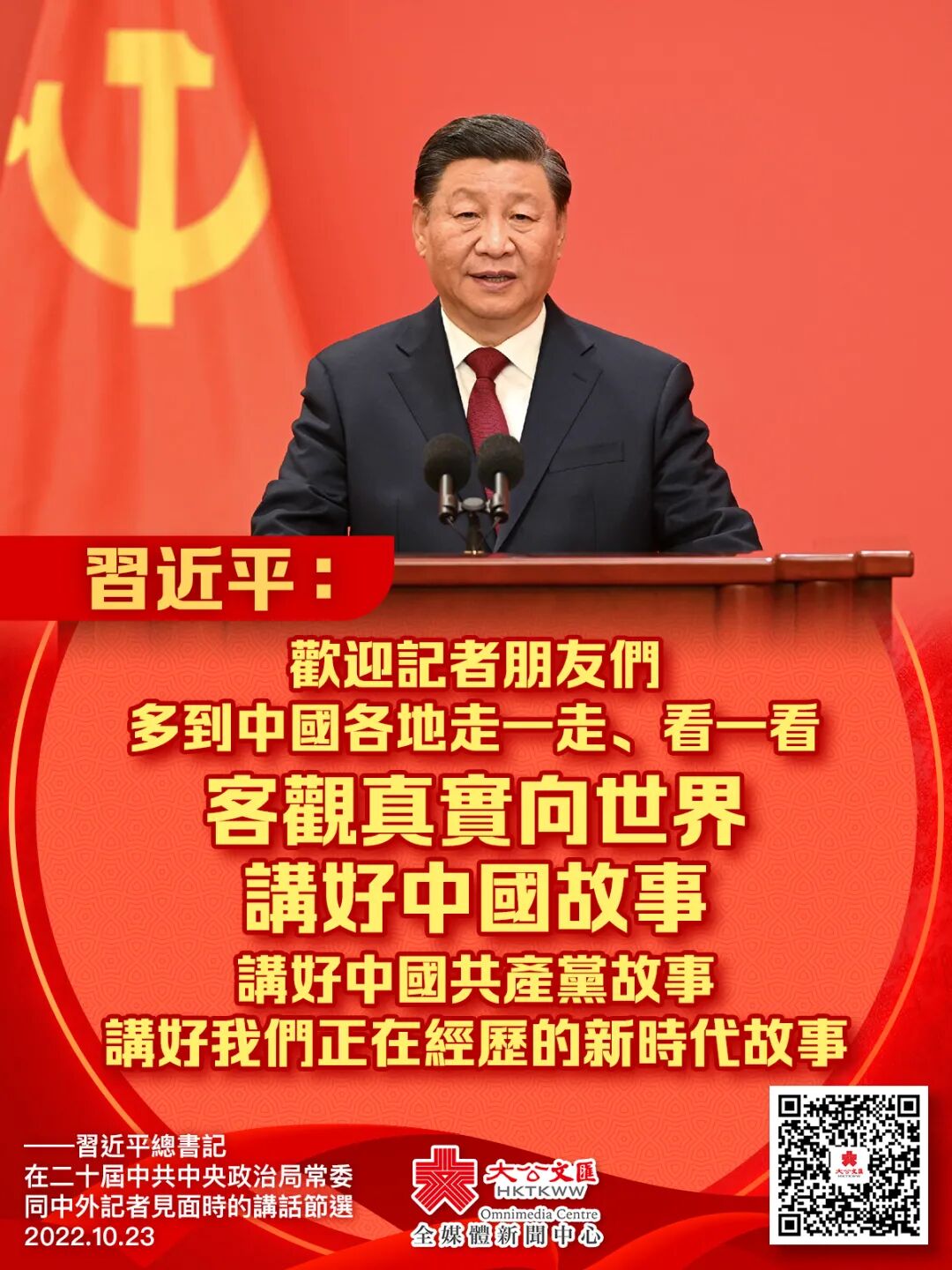 2022年10月23日,中國共產黨第二十屆中央委員會第一次全體會議新選出的中央政治局常委,同採訪中共二十大的中外記者見面。