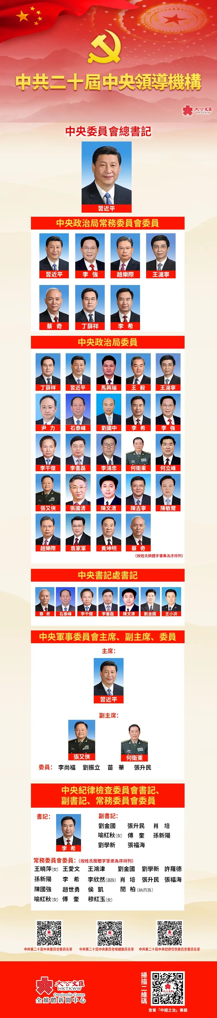 習近平總書記發表重要講話,「剛才,我們召開中共二十屆一中全會,選舉產生新一屆中央領導機構,選舉我繼續擔任中共中央總書記。現在,我向大家介紹其他六位常委同事:李強同志、趙樂際同志、王滬寧同志、蔡奇同志、丁薛祥同志、李希同志。趙樂際同志、王滬寧同志是十九屆中央政治局常委,其他同志都是十九屆中央政治局委員,大家都比較了解。」