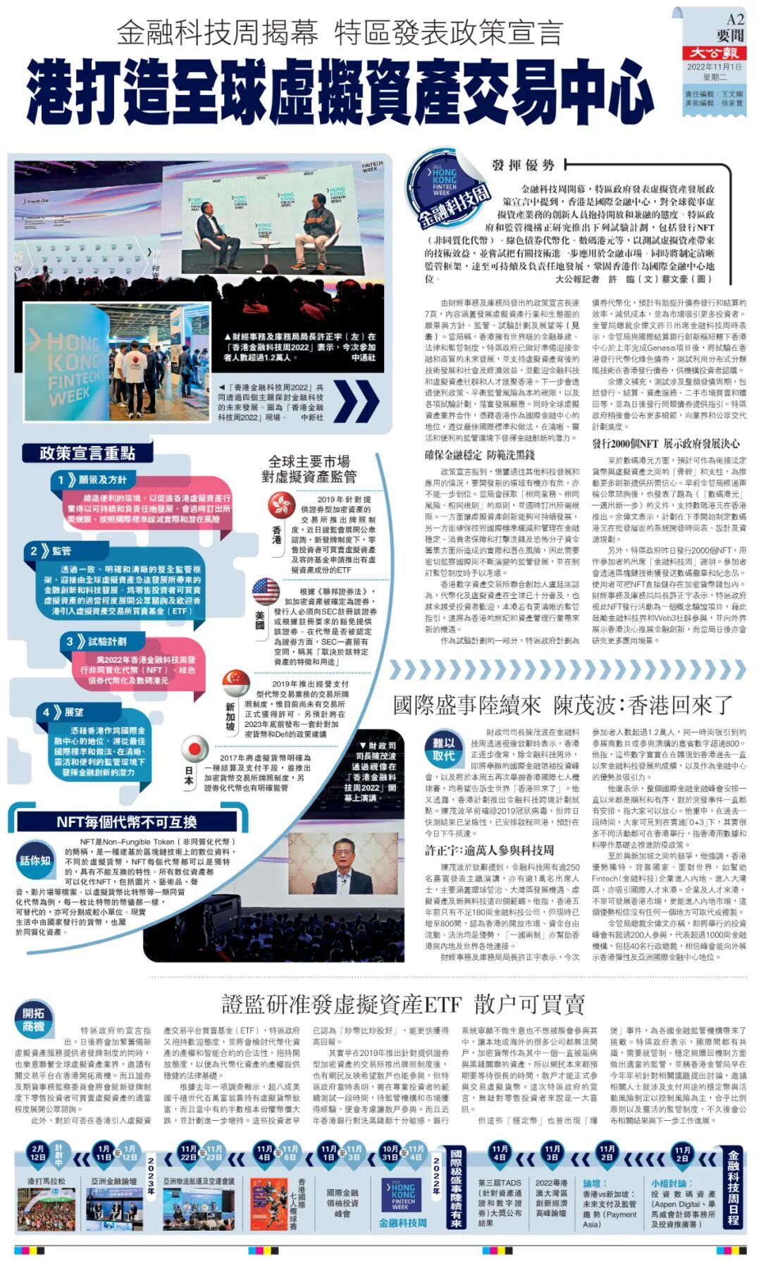 金融科技周開幕,特區政府發表虛擬資產發展政策宣言中提到,香港是國際金融中心,對全球從事虛擬資產業務的創新人員抱持開放和兼融的態度。特區政府和監管機構正研究推出下列試驗計劃,包括發行NFT(非同質化代幣)、綠色債券代幣化、數碼港元等,以測試虛擬資產帶來的技術效益,並嘗試把有關技術進一步應用於金融市場。同時將制定清晰監管框架,達至可持續及負責任地發展,鞏固香港作為國際金融中心地位。