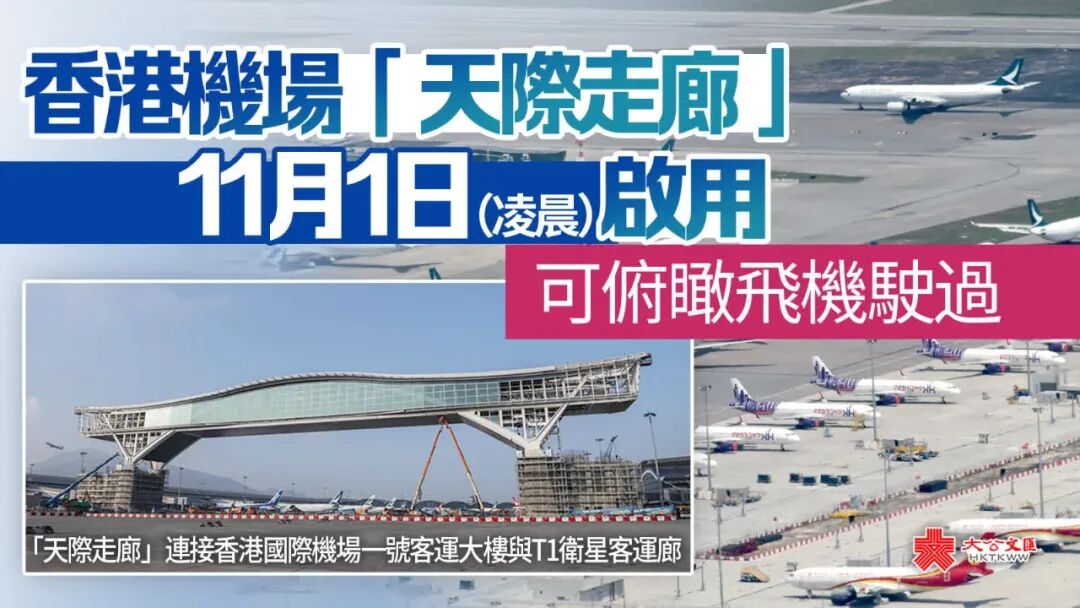 10.香港國際機場「天際走廊」今日凌晨啟用,旅客只需步行約8分鐘來往T1衛星客運廊。