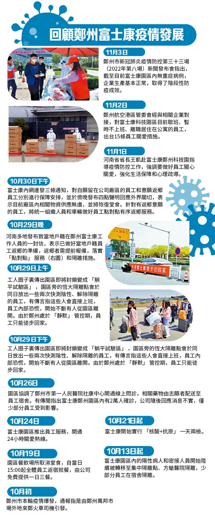 鄭州航空港區還對富士康科技園區目前歇班、暫時不上班、離職居住在公寓的員工出台15條員工關愛措施。其中包括改善就餐條件、提高防疫期間伙食標準、為每位員工配備足量防護用品、設置醫務室、加強環境消殺和垃圾清運、加強員工心理疏導等。