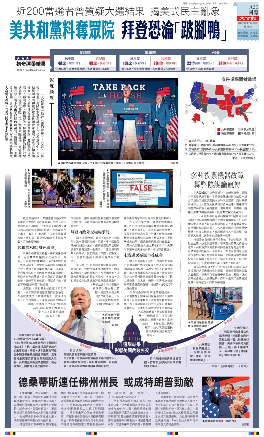 美國中期選舉狀況不斷,參院選舉關鍵州份佐治亞州部分申請缺席投票的選民未按時收到選票,亞利桑那州逾四分之一票站的投票機器發生故障。前總統特朗普等共和黨人藉機重提「選舉舞弊」陰謀論,指控民主黨試圖操縱選舉,民主黨官員堅決否認。
