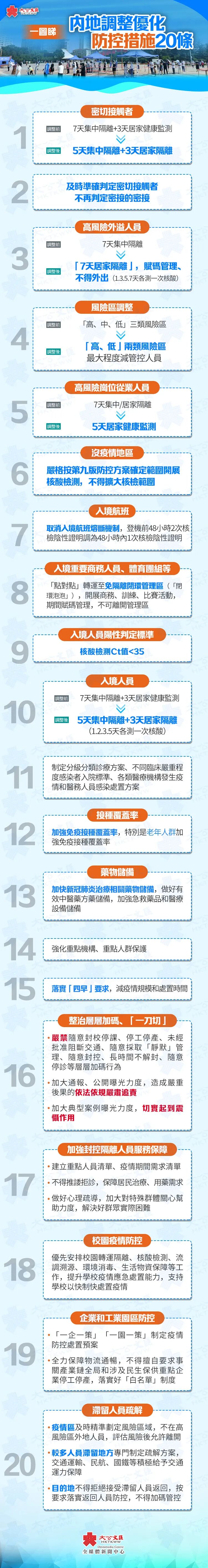 11日,國務院聯防聯控機制發布《關於進一步優化新冠肺炎疫情防控措施 科學精準做好防控工作的通知》,公布進一步優化防控工作的二十條措施。以下為極簡版: