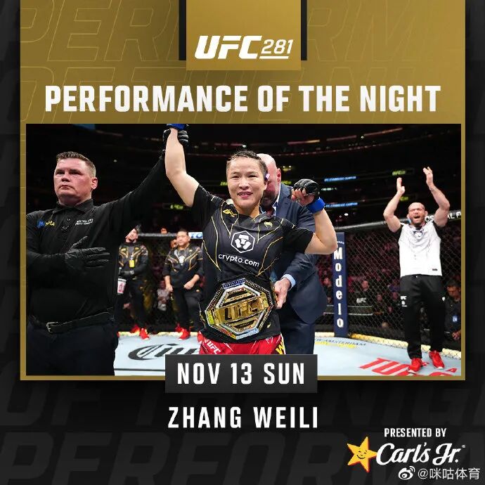 3.在UFC(終極格鬥冠軍賽)281中的女子草量級冠軍賽上,張偉麗戰勝了美國現任冠軍卡拉·埃斯帕扎,重新贏得了該級別的冠軍金腰帶。