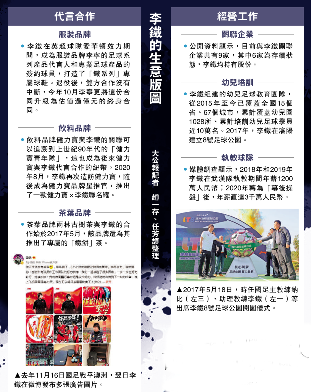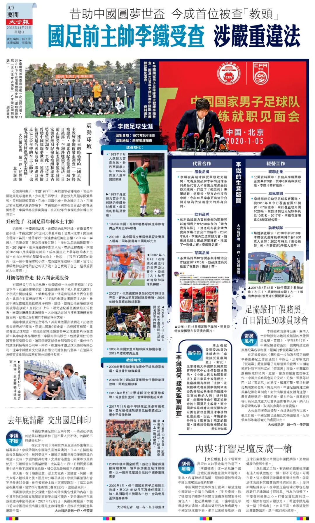 有媒體援引官方消息稱,李鐵最近一次公開亮相是11月2日下午,在瀋陽體院參加「運動訓練學院『名人名家大講堂』之李鐵公開訓練課」,活動結束後,他還與現場學生們合影留念。此前亦有媒體報道稱,11月8日李鐵從瀋陽前往大連,參加中國足協職業級教練員培訓班。隨後,便傳出他在培訓班期間被帶走調查。直到26日上午,湖北省紀委監委網站正式發布,李鐵涉嫌嚴重違法被查。大公報記者26日搜索瀋陽體育學院官網,發現已沒有關於李鐵的任何文章。