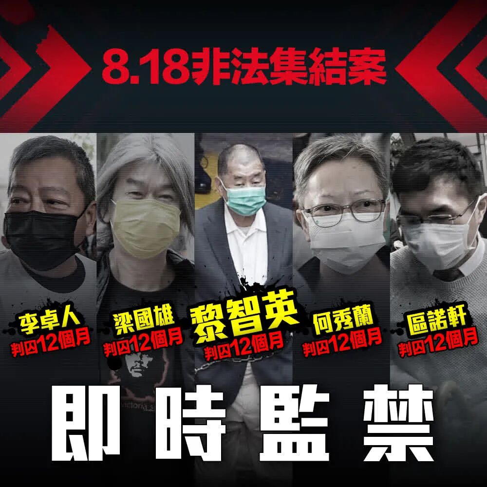 9.黎智英、李卓人等5人在8·18非法集結案中被裁定組織及參與未經批准集結兩罪成立,被判囚12個月,即時監禁。黎智英提出上訴要求推翻定罪及減刑,預計聆訊需時3天。