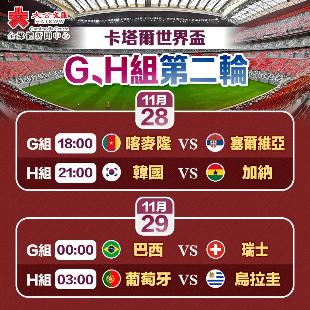 3.卡塔爾世界盃迎來第二輪小組賽最後4場賽事,喀麥隆隊迎戰塞爾維亞,韓國對決加納,C朗領銜的葡萄牙再遇老對手烏拉圭,缺少尼馬的五星巴西迎來瑞士挑戰。