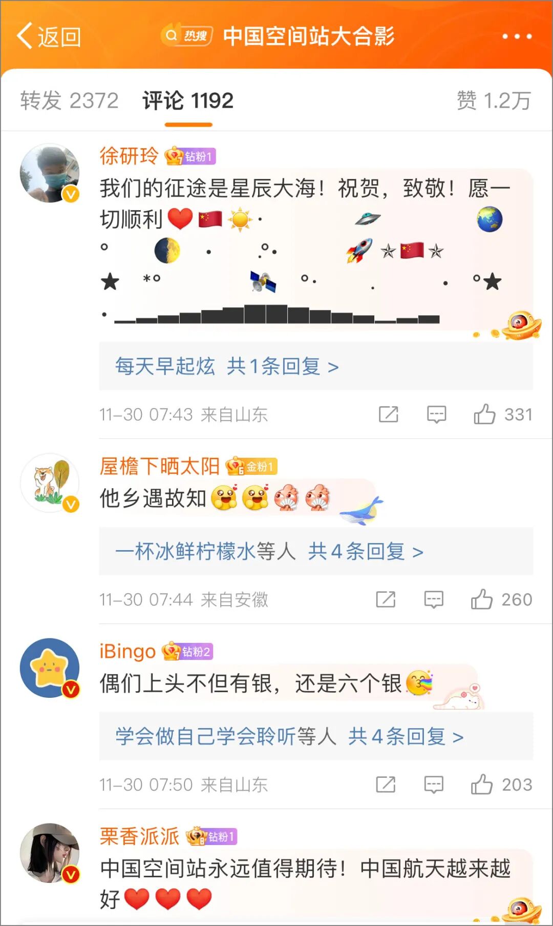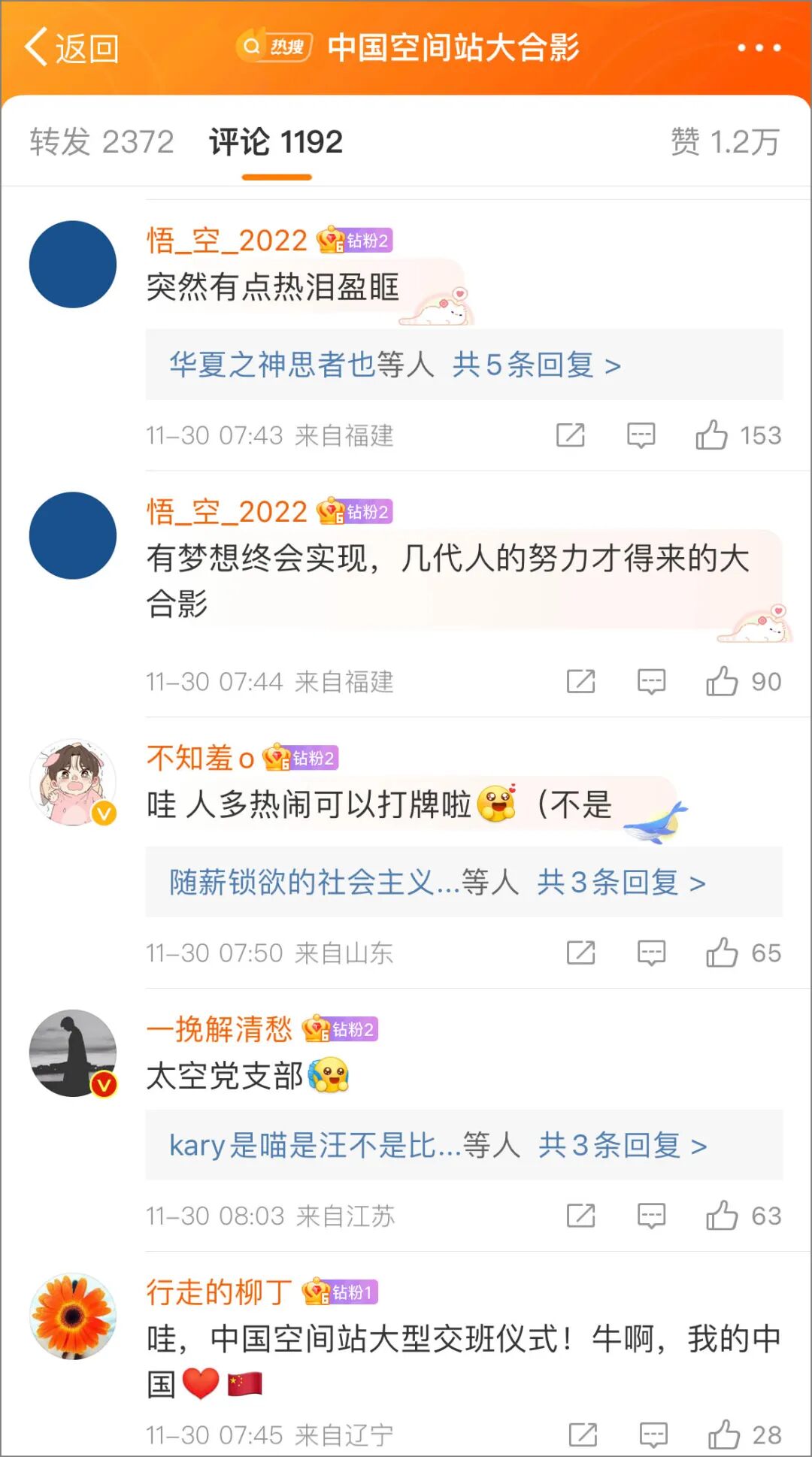 觀看視頻的網友很興奮:「中國太空站永遠值得期待!」,「我們上邊不但有人,還有六個人」,「幾代人的努力才得來的大合影」。