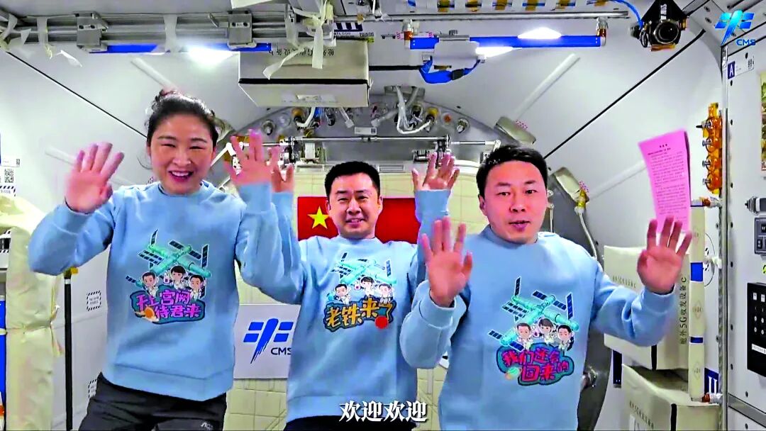 已在空間站中等候多時的神舟十四號航天員陳冬、劉洋、蔡旭哲,早已按捺不住激動的心情,他們專門換上有趣的「歡迎服」為迎接戰友錄製視頻。「老鐵來了!我們想死你們了!」神十四指令長陳冬身穿「老鐵來了」字樣的衞衣,滿臉笑意歡迎着戰友。「盼望着,期待着,我們等得花兒都快謝了!」劉洋身着「天上宮闕待君來」字樣的衞衣,喊出「只為等你來!」蔡旭哲的衞衣寫着「我們還會回來的」,他來說,「十五的兄弟,歡迎你們來到『太空家園』,來吧,先擁抱一下吧!」三人一起轉身,衞衣背後字樣組成「歡迎入駐中國太空家園」,神十四乘組迎戰友的歡喜之情溢於言表。
