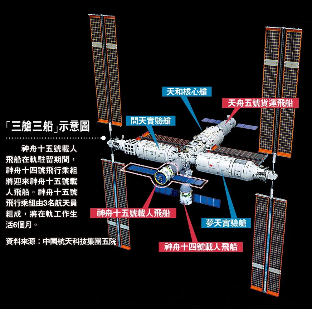 這是中國首次實現空間站6個型號艙段組合體結構和6名航天員在軌駐留的「太空會師」。神舟十五號發射成功之後,通過快速交會對接的方式與空間站形成組合體。中國空間站形成「三大艙段+三艘飛船」,總重量接近100噸的空間站組合體。