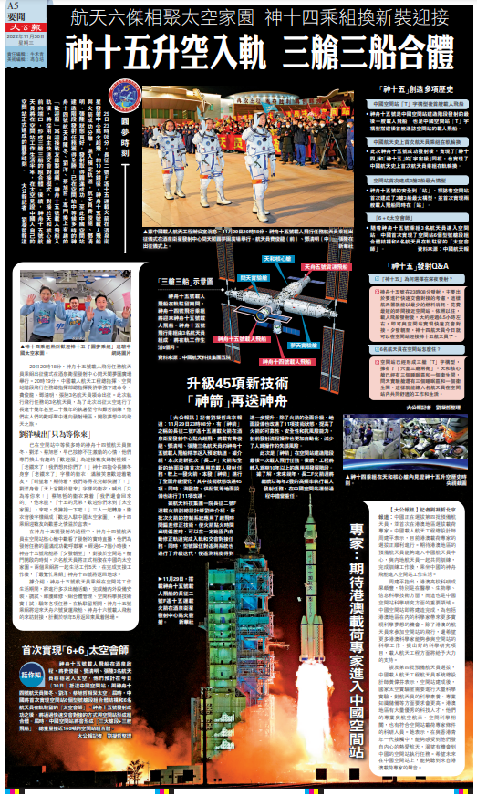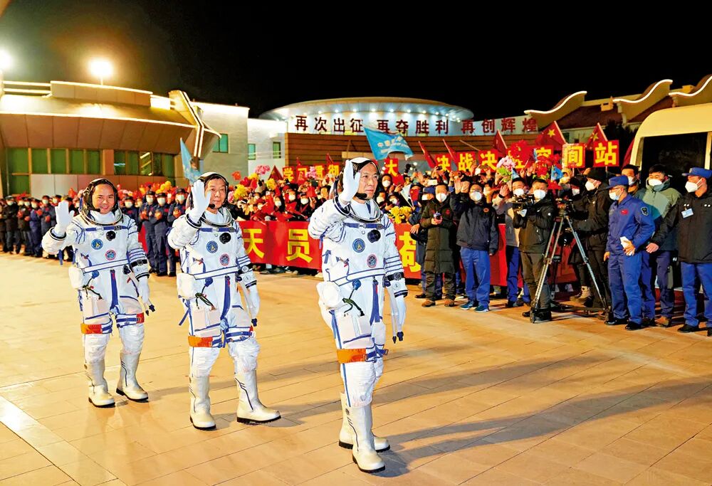 神舟十五號載人飛船在酒泉啟程,將費俊龍、鄧清明、張陸3名航天員穩穩送入太空,他們今早抵達中國空間站,與神舟十四號航天員陳冬、劉洋、蔡旭哲相聚太空。