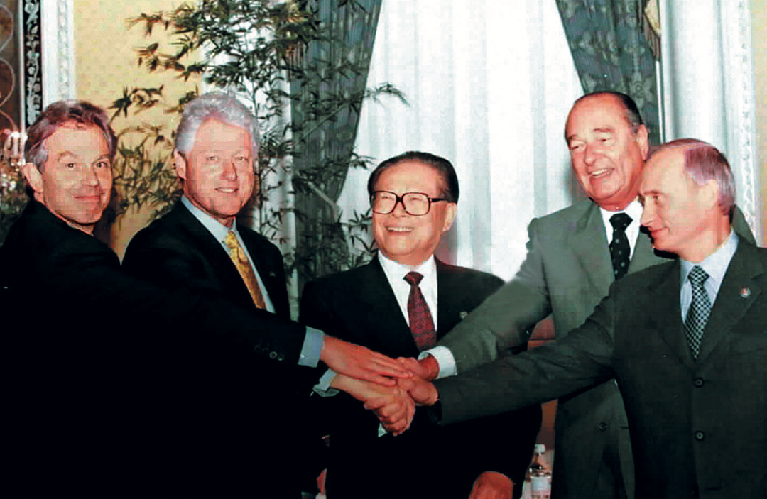 2000年9月7日,由中國倡議的聯合國安理會五個常任理事國首腦會議在紐約舉行。江澤民(中)同法國總統希拉克(右二)、俄羅斯總統普京(右一)、英國首相布萊爾(港譯:貝理雅)(左一)、美國總統克林頓(左二)握手合影。(新華社)