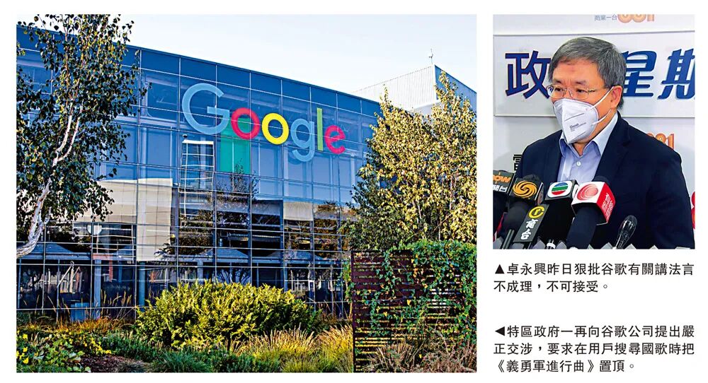 特區政府要求Google將正確國歌置頂被拒,政務司副司長卓永興昨日表示,Google的回應不能接受,形容是「言不成理」。他指Google作為國際領先的搜尋器,首要責任是提供正確資訊。政府會再去信Google作出質詢。