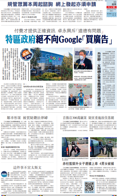 政務司副司長卓永興昨日指出,有關講法言不成理,不可接受;付費可以置頂,但「不付費就不幫你做」,涉及專業與道德問題,特區政府不會因此向谷歌付費買廣告。
