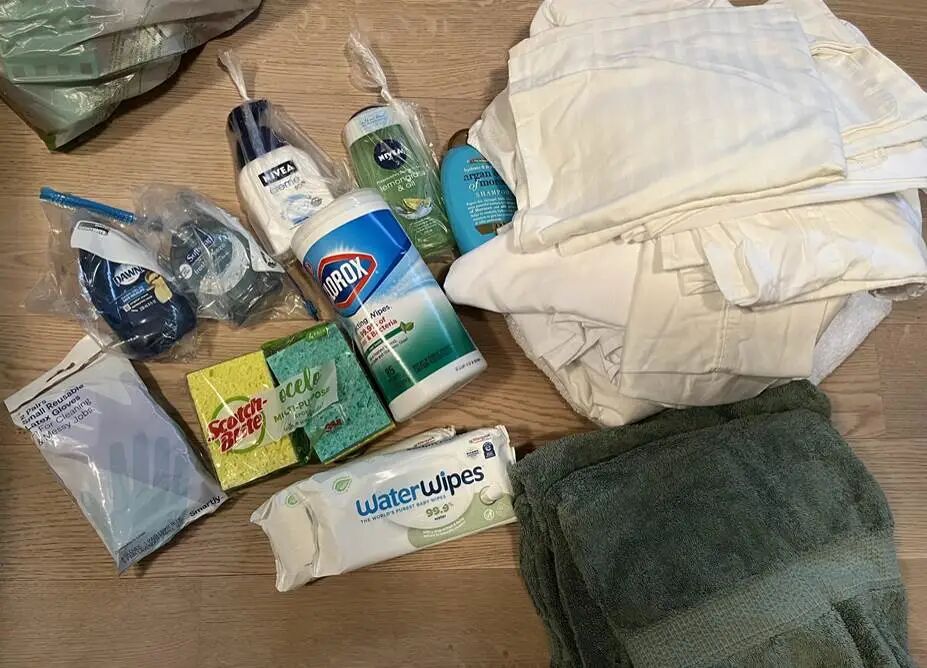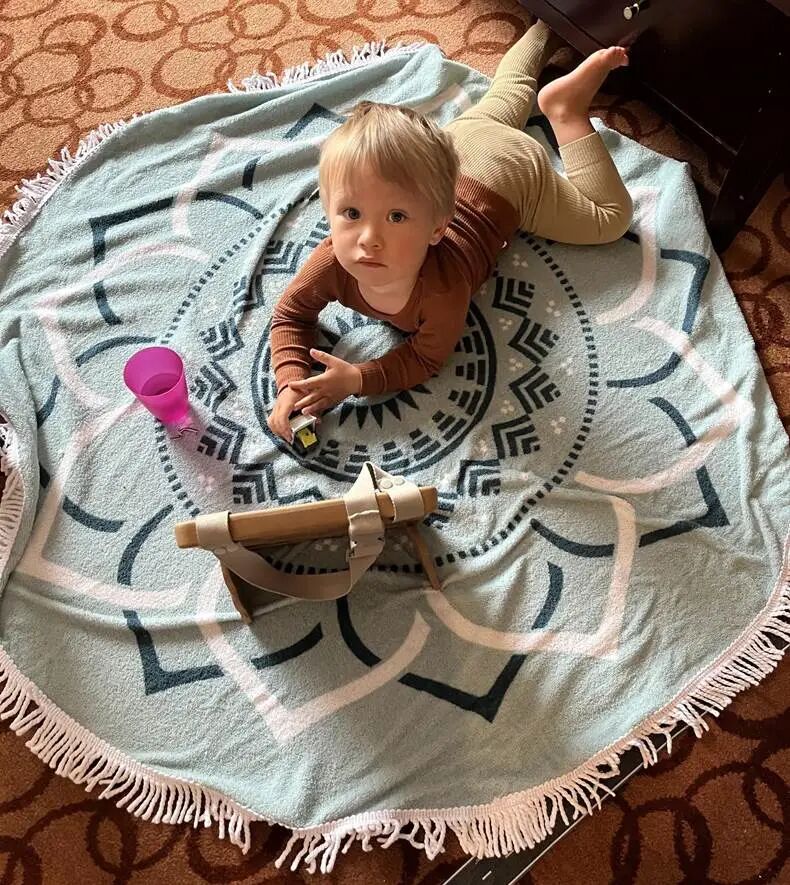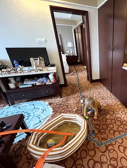 Quarantine hotel rooms are known to not be thoroughly cleaned in between “guests” and mostly just sprayed with layer upon layer of disinfectant, making carpets and fabrics damp (and moldy in the hot months). Unfortunately we knew that our hotel would not have hardwood floors, and after hearing about the conditions of other hotel rooms and floors, I made sure to bring extra sets of sheets, towels and playmats to cover up as many things as possible for my active floor crawler.