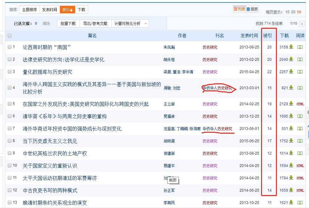 之后对于入选的这27个期刊,以中国知网作为数据库检索平台,以五年作为时间跨度,也就是从2013年1月1日到现在(2018年2月13号检索),进行“被引频次”检索,之后对检索结果降序排列,从中选取其中“被引频次”最高的前10篇论文。