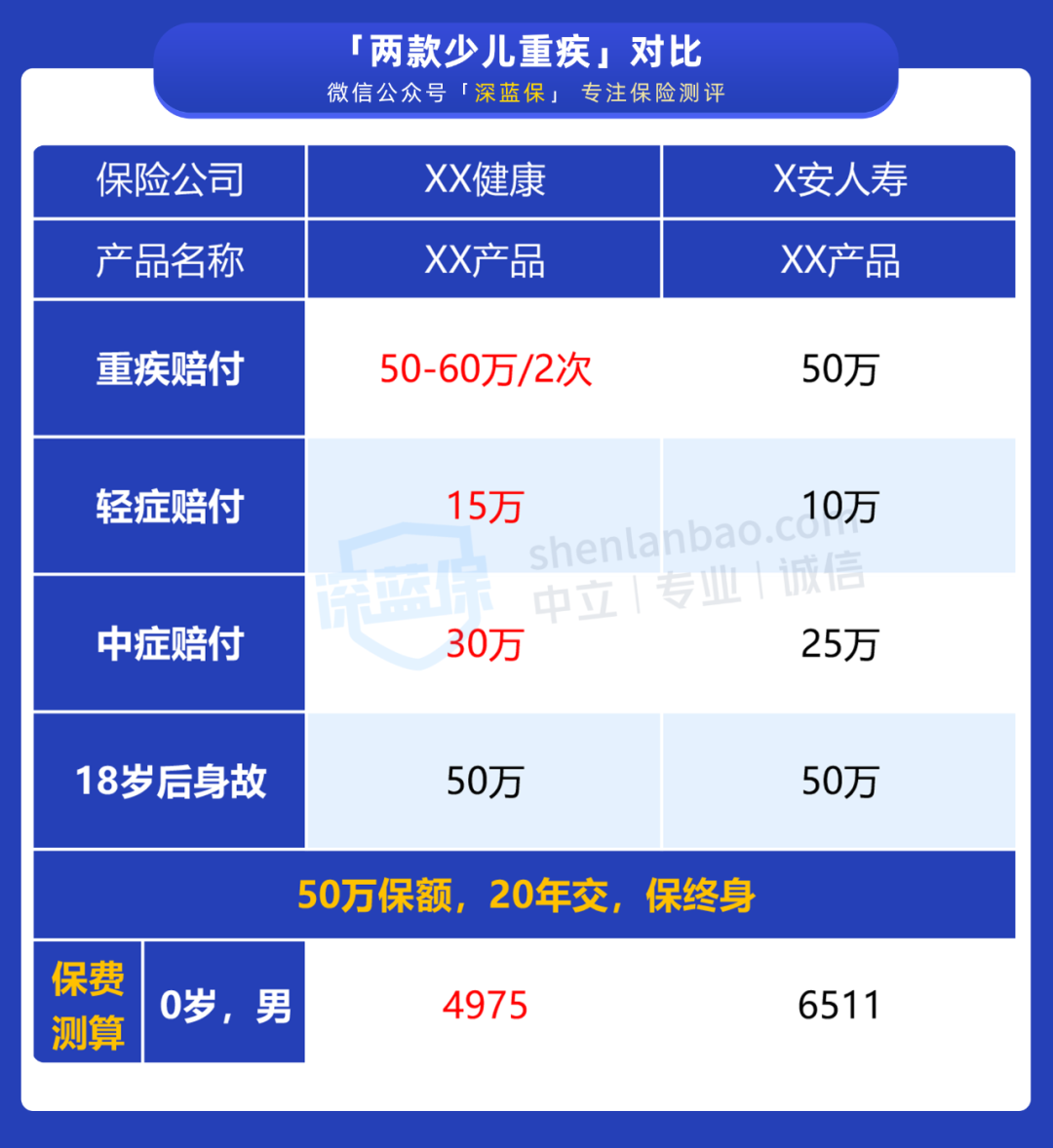 比如说,妈咪保贝、健康福少儿重疾,买 50 万保额,万一得了白血病可以赔 100 万。