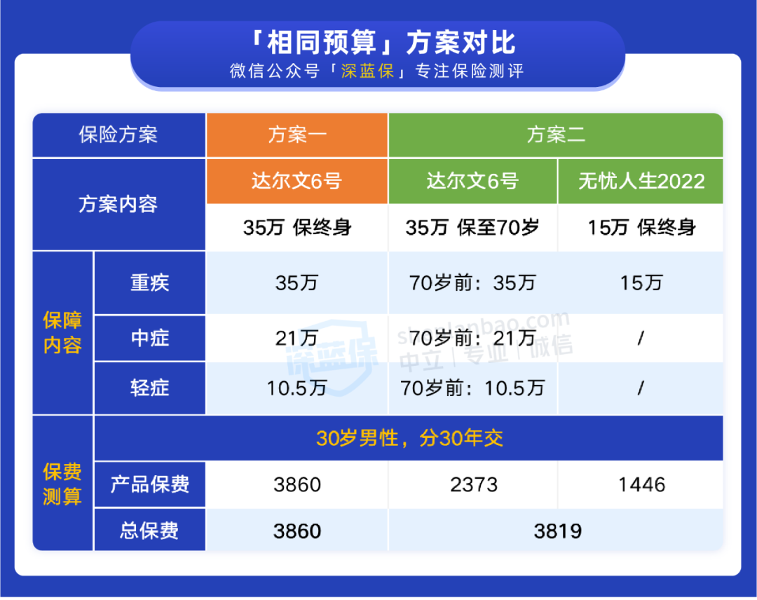 方案二:「达尔文 6 号」35 万保额保至 70 岁,无忧人生 2022 买 15 万保额保终身,70岁前重疾保额有50万,很充足,70 岁后也有 15 万保额。