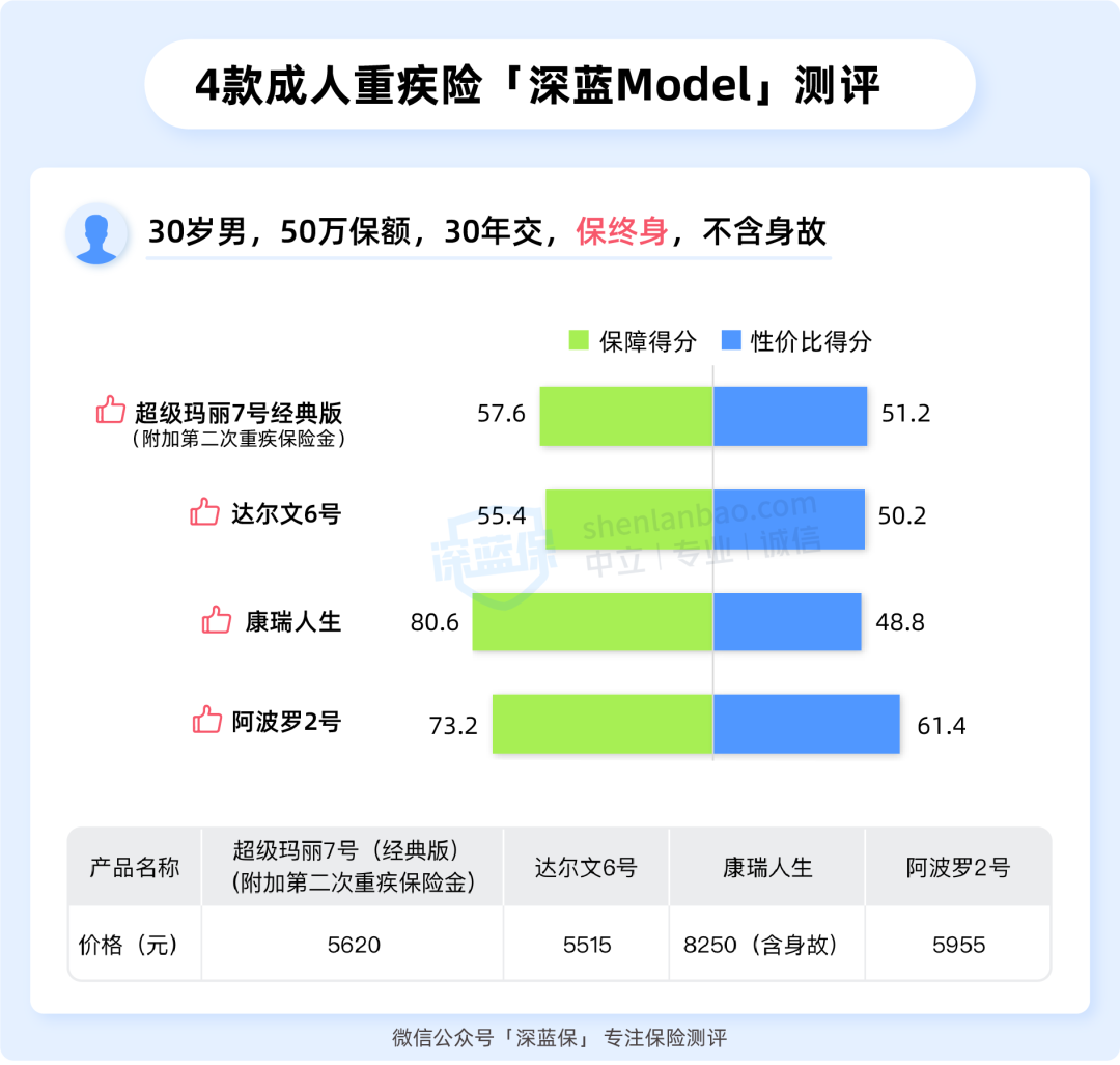我们挑选了 4 款高性价比重疾险,并且会用「深蓝Model」来对比几款产品的保障和性价比差异。