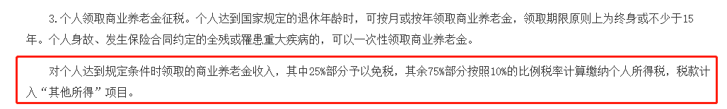 其实早在 2018 年,国家就在上海、江苏等地进行“养老保险第三支柱”的试点,并发布了相关通知,明确了个人领取商业养老金时的税率为 7.5%: