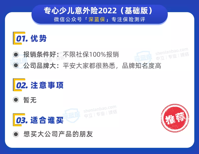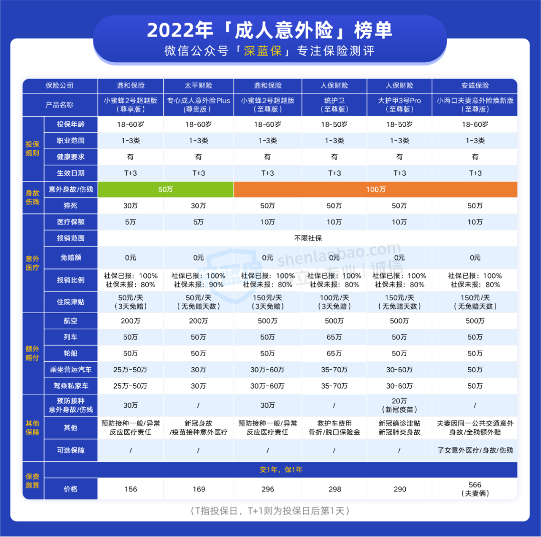 小顽童 2 号(基础版)可附加意外住院津贴,加上之后只贵了 9 块钱,如不幸因意外住院,每天可以领 100 元,还是很不错的,有需要的朋友可以考虑附加。另外,众安少儿意外险 2022 保障也很不错,价格也很便宜。不过要注意,2 米及以上高空意外坠落导致的身故或伤残,这款产品是不赔的,如果介意这一点,可以考虑其他产品。这款产品是大公司的产品,看重品牌的朋友,可以优先考虑。部分朋友的投保页面,显示的承保公司可能是“中国大地保险”,这点不影响购买,保障内容都一样。以上几款少儿意外险,点击下方小程序进入深蓝保小程序就能找到。成年人是家庭的经济支柱,万一发生意外,整个家庭都会陷入经济困境。所以意外险对成年人来说也至关重要,我们建议保额至少 50 万起步,预算够的最好买个 100 万甚至更多。18~60 岁的成年人,可以重点关注这 6 款产品: - 原因:专心成人意外险 Plus(尊贵版)不限社保,0 免赔,经社保报销后能 100% 报销,未经社保结算,能报 90%,报销比例更高。