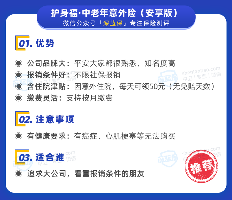 大护甲 3 号 Pro 的 100 万版本保障很不错,自带 50 万保额的猝死保障,意外医疗保额有 10 万、不限社保,还有意外住院津贴。价格也便宜,每年只要 290 元。另外,统护卫(至尊版)也是人保财险承保,性价比也很不错。它还有一个 120 万版本可选,价格只要 359 元,想要高保额的朋友可以考虑,详细了解可以点击查看>>>这款产品的 50 万和 100 万版本都值得考虑,保障上不输大护甲 3 号 pro,详细测评可以点击这里查看>>>需要注意的是,虽然它没有健康告知,但要求“未罹患重疾,身体健康”才能投保。我们也帮大家确认过,像单纯的高血压、2 型糖尿病等,只要不影响正常生活,就可以购买。如果职业符合 1~3 类的投保要求,就算发生了高空意外事故,如高空坠落导致的意外身故或伤残,也是可以理赔的。专心成人意外险 Plus 报销不限社保,经社保结算后能 100% 报销,未经社保结算报销,也能按 90% 的比例报销,要优于其他同类未经社保结算只能报销 80% 的产品。不过要注意,如果因以下情况发生的意外身故或伤残,赔付的保额会降低。如意外身故,只能赔付 30% 保额:这款产品要求夫妻一起投保,两人购买至尊版每年只要 566 元。如果夫妻两人因同一公共交通意外导致身故或全残,每人额外赔 50 万。以上几款成人意外险,点击下方小程序进入深蓝保小程序就能找到。老人年纪大了,容易发生骨折等意外受伤的情况。因此,在挑选老人意外险时,我们建议重点关注意外医疗。我们帮大家筛选了 4 款产品:这款产品的保障很不错,不限社保 100% 报销,还有意外住院津贴,一天能领 80 元,也没有免赔天数,详细测评可以点击了解>>>如果父母年龄在 60 岁以下,更建议优先给他们买 小蜜蜂 2 号超越版,价格没贵多少,但保障更全面。在产品的投保页面,也有显示是“中国大地保险”承保的,保障内容都一样,大家知道有这回事就好。部分朋友因为职业涉及到中高风险,比如:出租车司机、消防员等,大多数普通意外险买不了。- 原因:无忧保综合意外险有变动,4 类及以上职业已无法投保。人保 1-6 类职业意外险对职业要求宽松,报销比例也很高。